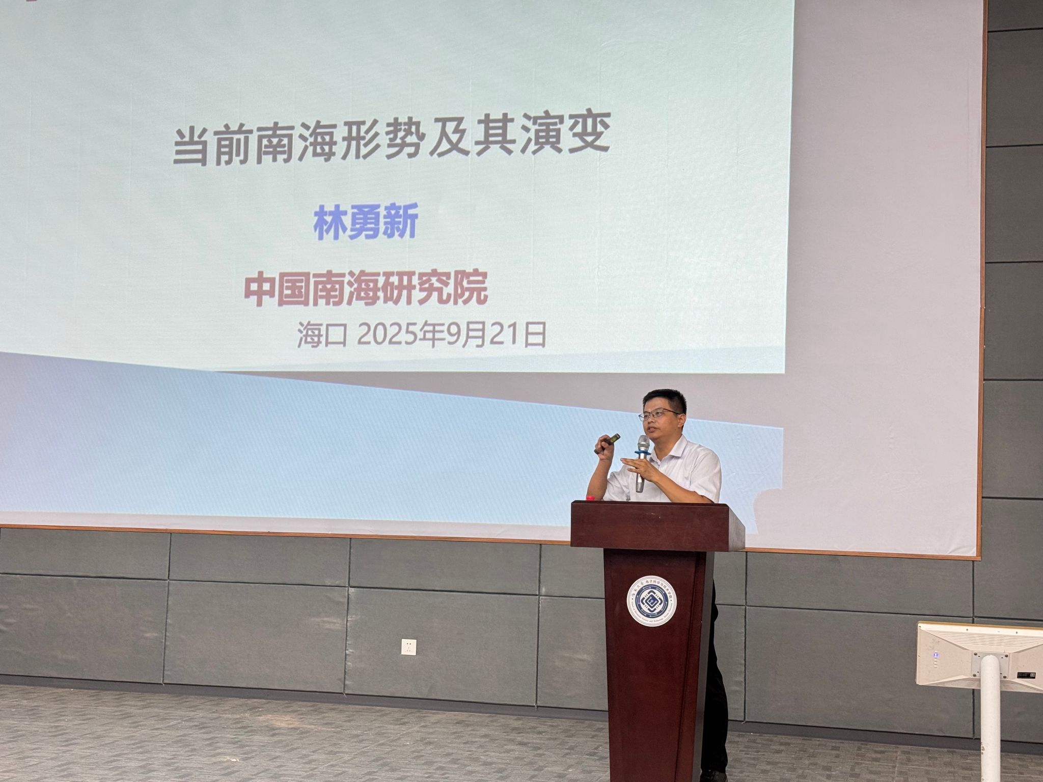 中国南海研究院林勇新处长为新生详细阐述南海形势与国家战略,包括南海形势与中美博弈紧密相关,中国通过科技发展和海洋战略维护主权,同时推动海南建设海洋强省。