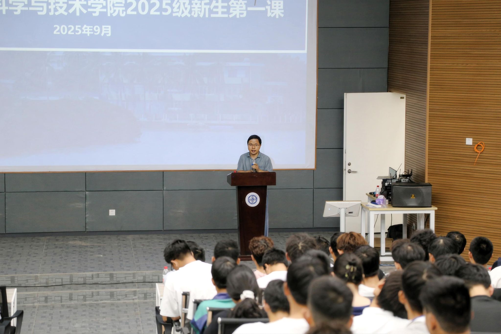 9月21日下午14:30,电子科学与技术学院2025级新生开学典礼在信息科技大楼二楼报告厅隆重举行。学院院长刘马良、党委书记林华、副院长王冠军、副院长李娜、教师代表王微微教授、简明朝博士、王诗兆博士、何政博士、夏迎军博士、徐鹏博士、杨德坤博士、吴迪博士、教研办、综合办、老生代表乔馨驰、新生代表张广宇和2025级全体新生共同参会。学院邀请海德书院韩胜丁书记、南海书院王一凡副书记致辞,中国南海研究院处长林勇新做关于南海形势的报告。会议由副院长王冠军主持。